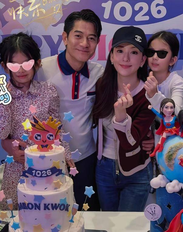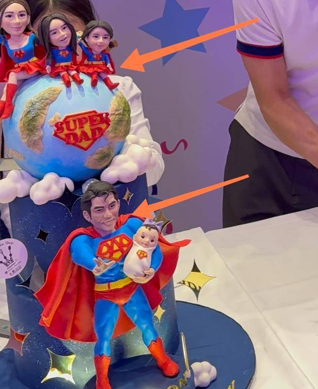 这次真是双喜临门, 刚添了个小公主, 又过60大寿, 难怪那么高兴, 连蛋糕上都做了一家五口的图案, 全是卡通超人的造型, 方媛带着两个女儿坐上面, 郭富城在蛋糕上抱着那个刚出生的三女儿, 喜感是足的, 也能看出来他是真高兴,