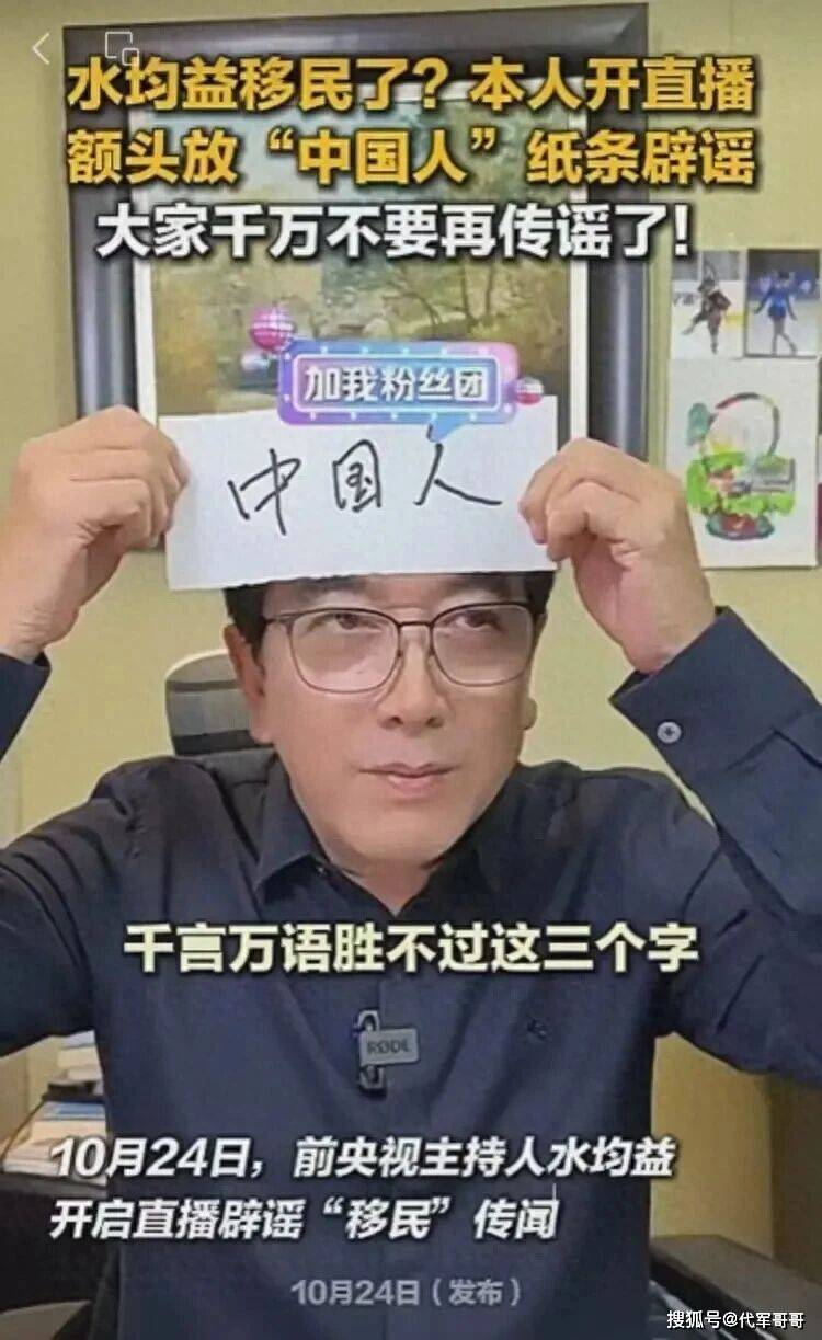 10月24日,前央视主持人水均益开直播时,额头放“中国人”纸条否认移民传闻,请大家千万不要再传谣了。水均益移民谣言的产生和传播,并非偶然,而是多种因素共同作用的结果 。从公众心态来看,对知名人士动向的过度关注是一个重要原因。在信息时代,公众对名人的生活有着强烈的好奇心,尤其是像水均益这样曾经在央视占据重要地位的知名主持人,他的一举一动都容易成为焦点 。当他减少在公众视野中的露面,前往加拿大的消息传出后,便引发了公众的种种猜测,这种好奇心在缺乏事实依据的情况下,很容易被谣言所利用 。