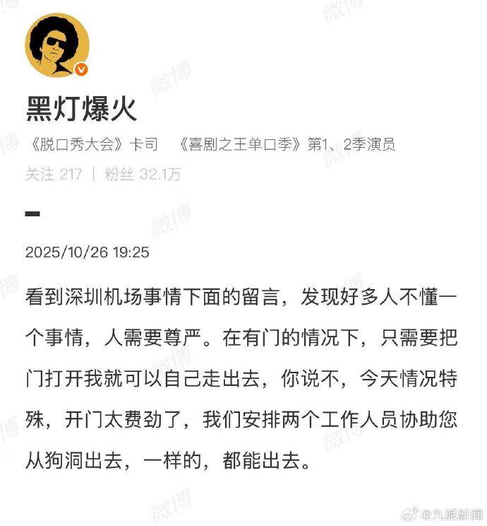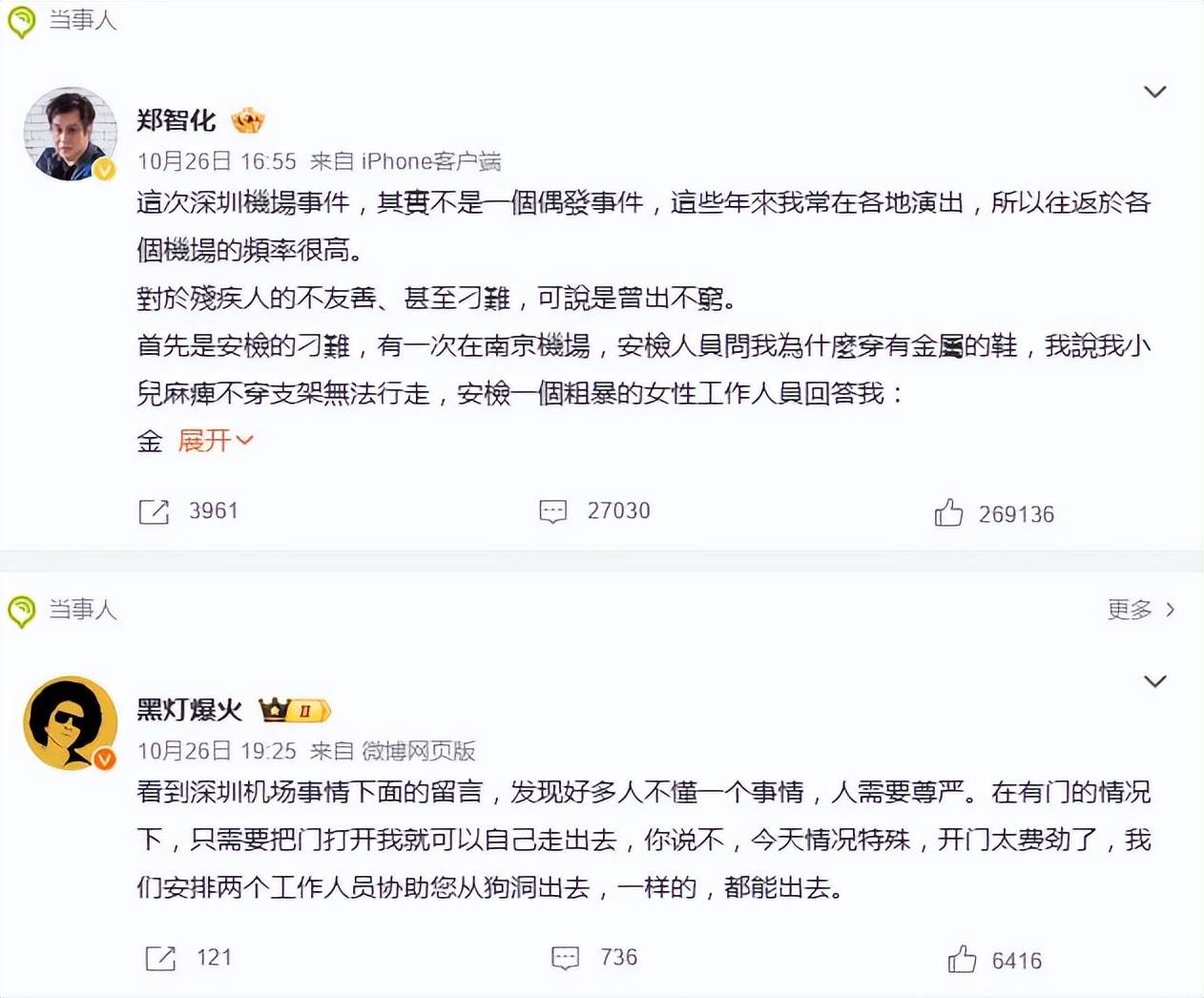26日晚,盲人脱口秀演员黑灯以犀利比喻介入讨论:“发现好多人不懂一个事情,人需要尊严。在有门的情况下,只需要把门打开我就可以自己走出去,你说不,今天情况特殊,开门太费劲了,我们安排两个工作人员协助您从狗洞出去,一样的,都能出去。”他的发言撕开了公共服务中容易被忽视的裂痕:当流程设计忽视个体感受,即便最终达成“通行”结果,亦可能让使用者陷入“连滚带爬”的窘境。郑智化随后在社交平台又此前列举的南京机场要求卸金属支架、新疆机场强制托运拐杖、上海机场超时检查等经历,进一步印证了残障人士在标准化流程中面临的系统性困境——安检必要性与人性化变通之间的平衡,始终是待解的课题。