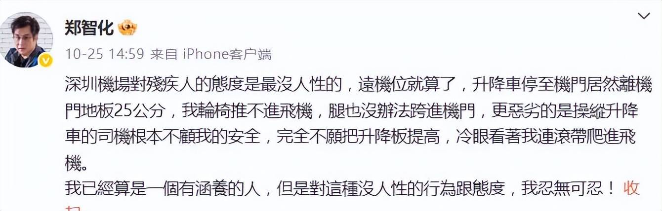 10月25日,歌手郑智化在社交平台发布的一则控诉长文,将深圳机场推至舆论漩涡中心。文中直指机场残疾人服务存在严重缺陷:远机位升降车与机门存在近25公分高度差,轮椅无法推进、