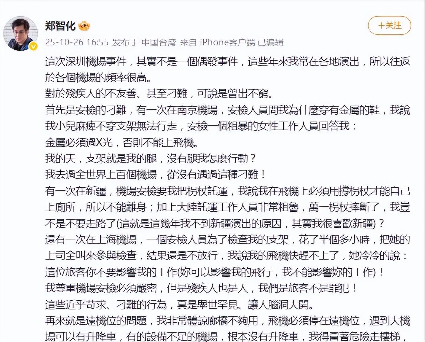 10月25日,歌手郑智化在社交平台发布的一则控诉长文,将深圳机场推至舆论漩涡中心。文中直指机场残疾人服务存在严重缺陷:远机位升降车与机门存在近25公分高度差,轮椅无法推进、腿部难以跨越,而操作司机对其安全诉求置之不理。当晚,深圳机场火速在评论区致歉,并对于相关问题,已第一时间会同航空公司启动核查。郑智化随后表态“不再追究”,并将事件归因为“司机个人恶劣行径”,但这场风波掀起的讨论却持续发酵。