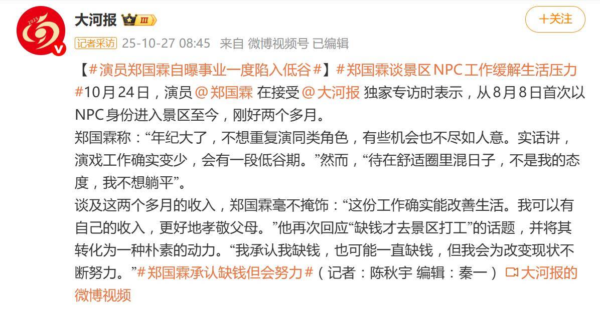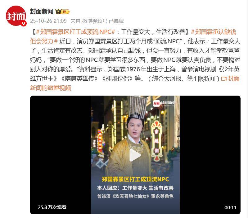 据10月26日报道,“郑国霖承认缺钱但会努力”的消息意外刷屏。这位曾凭《隋唐英雄传》李世民等角色惊艳观众的演员,如今身穿古装、手持道具,成了景区里被游客围堵的&