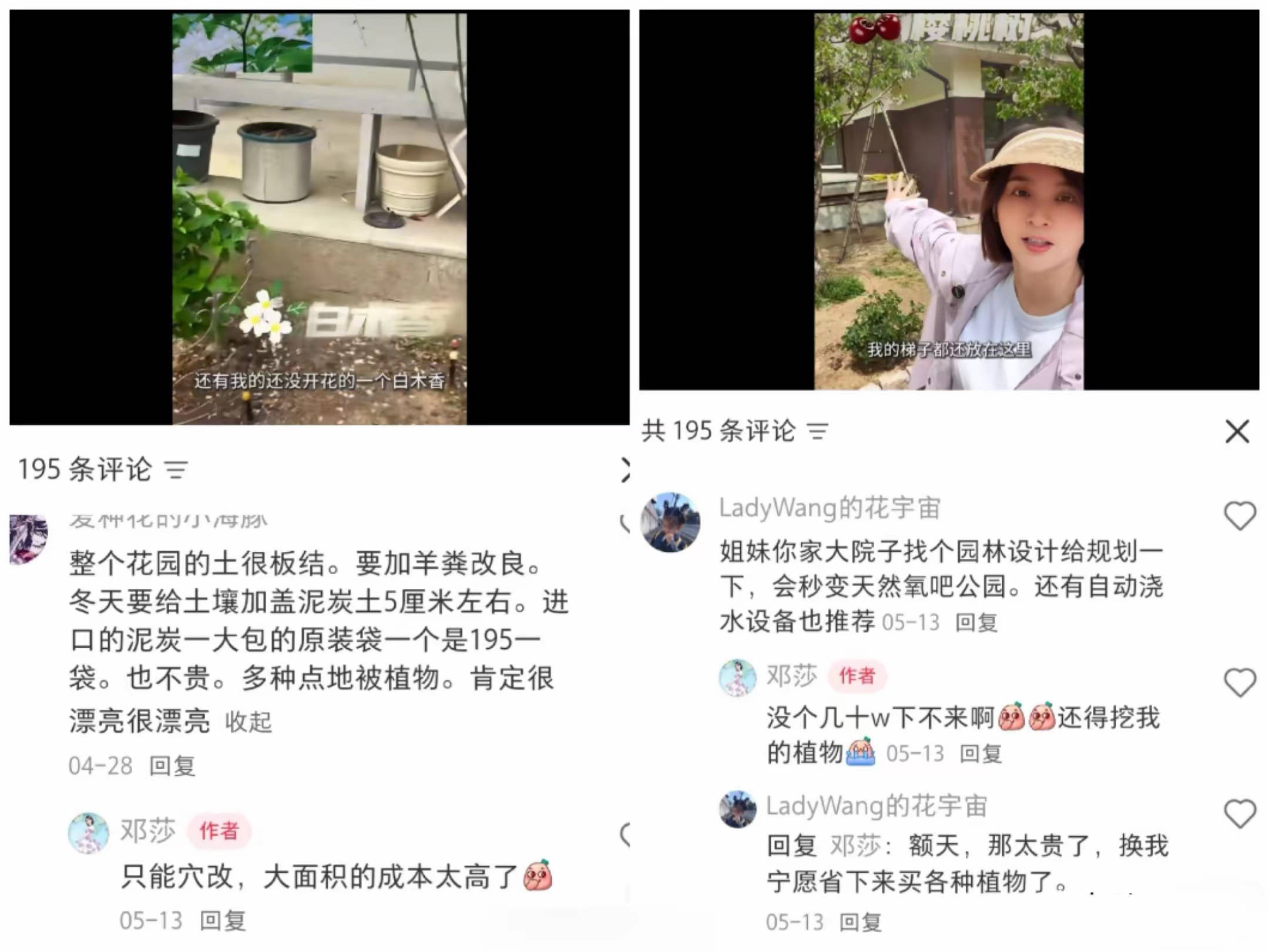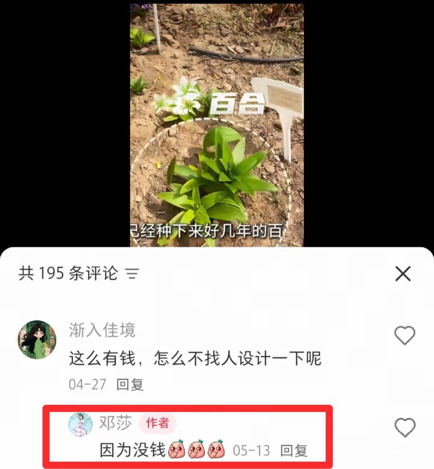 在打理家中花园的视频中,网友看不惯她家里乱糟糟的花园、问她为什么不招人设计一下呢?邓莎也是直白的回答:因为没钱。