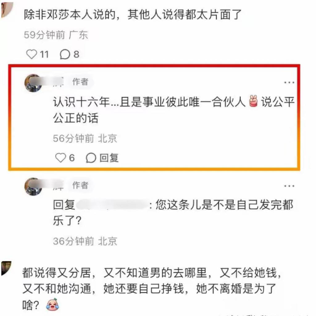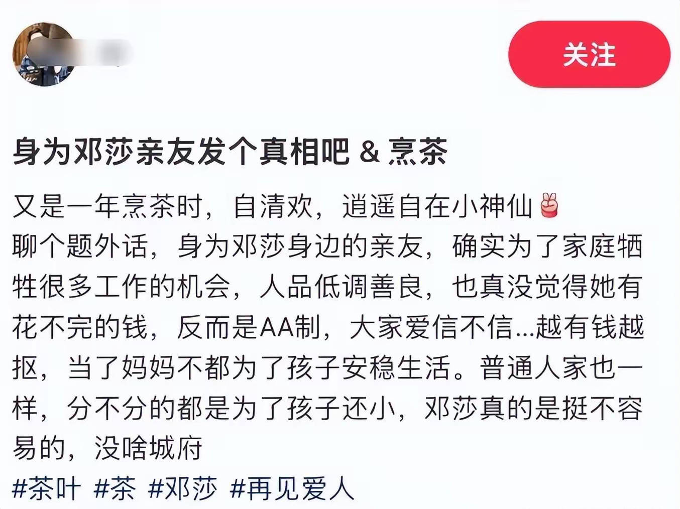 也有邓莎的亲友,站出来力挺邓莎。认为她确实为家庭牺牲了很多,邓莎平日里为人低调善良,在家庭里都是AA的,她根本没有花不完的钱。