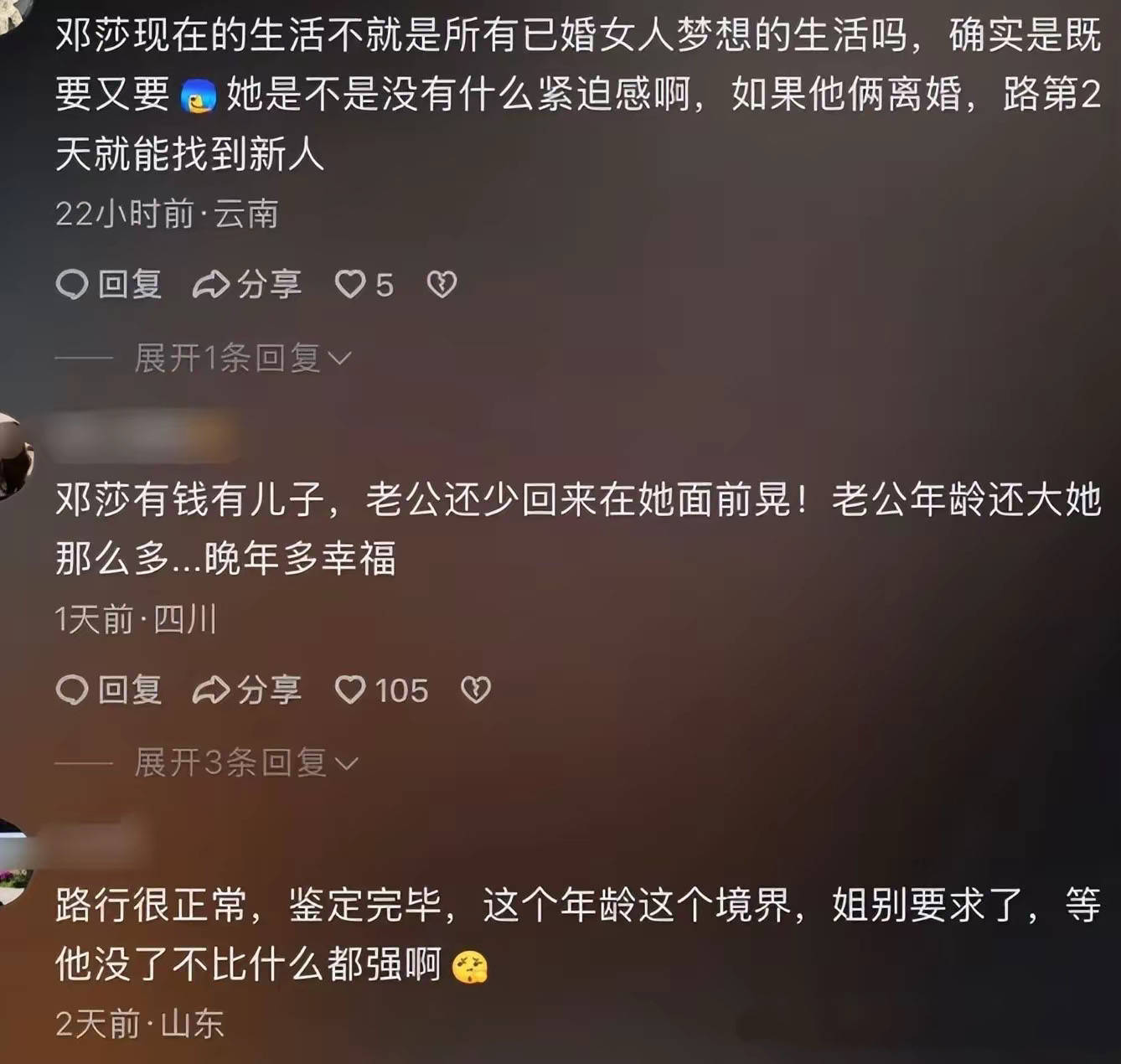 当然也有人羡慕邓莎,觉得她的生活状态就是已婚女人的梦想。甚至邓莎自己有钱有儿子,老公还少回来在她面前晃,已经很幸福了。