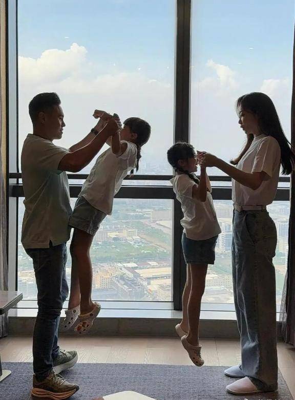熊黛林发照片 庆祝结婚9周年, 配文 很简单, 就一句“9周年快乐”, 信息量 真的挺大的,一家四口, 穿得都挺简单, 就是白t恤配牛仔裤, 很清爽的感觉, 熊黛林那个身材, 真没