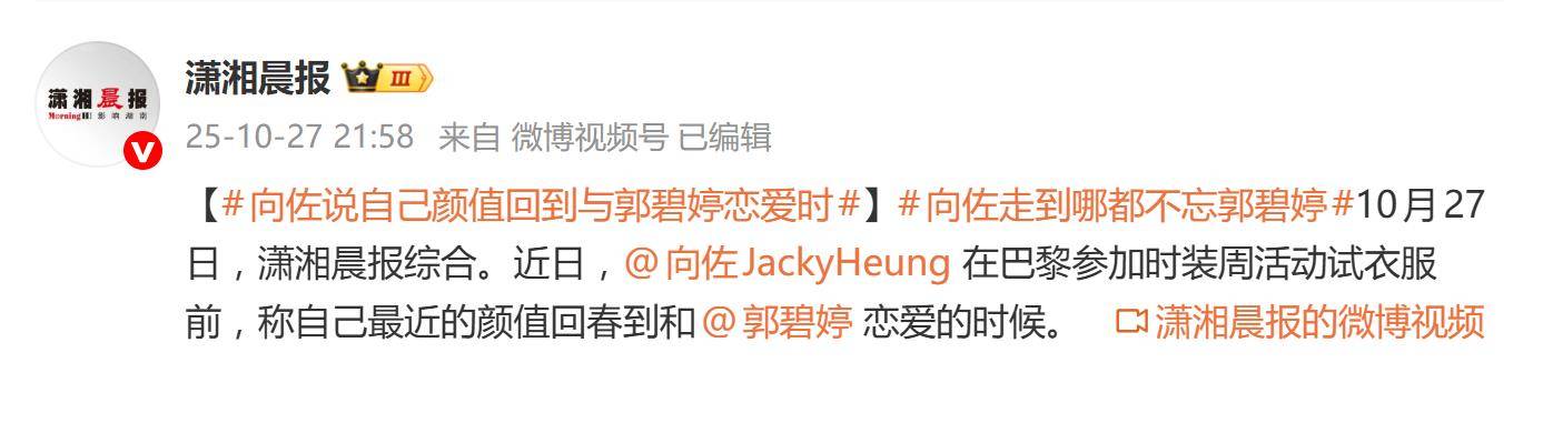 据10月27日报道,向佐在巴黎时装周试衣时的一番“颜值宣言”,成功吸引了全网注意。这位向来以硬汉形象示人的男星,对着镜头自信表示,自己最近的颜值状态已“回春”到2019年和郭碧婷热恋时的巅峰水平,还顺势秀了把“陪碧婷选婚纱”的回忆杀,被网友调侃“走到哪都不忘撒糖”。