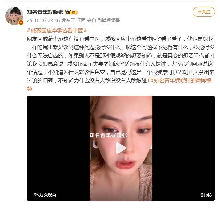 事件发酵一周后,戚薇在10月27日的直播中被问及此事。她完全没有回避,大方承认李承铉确实去看了中医,并甩出了一番“耿直”回应:“聊这个问题不觉得有什么无法启齿的。”她强调,只要对方是真心提问而非戏谑,自己就很愿意讨论。