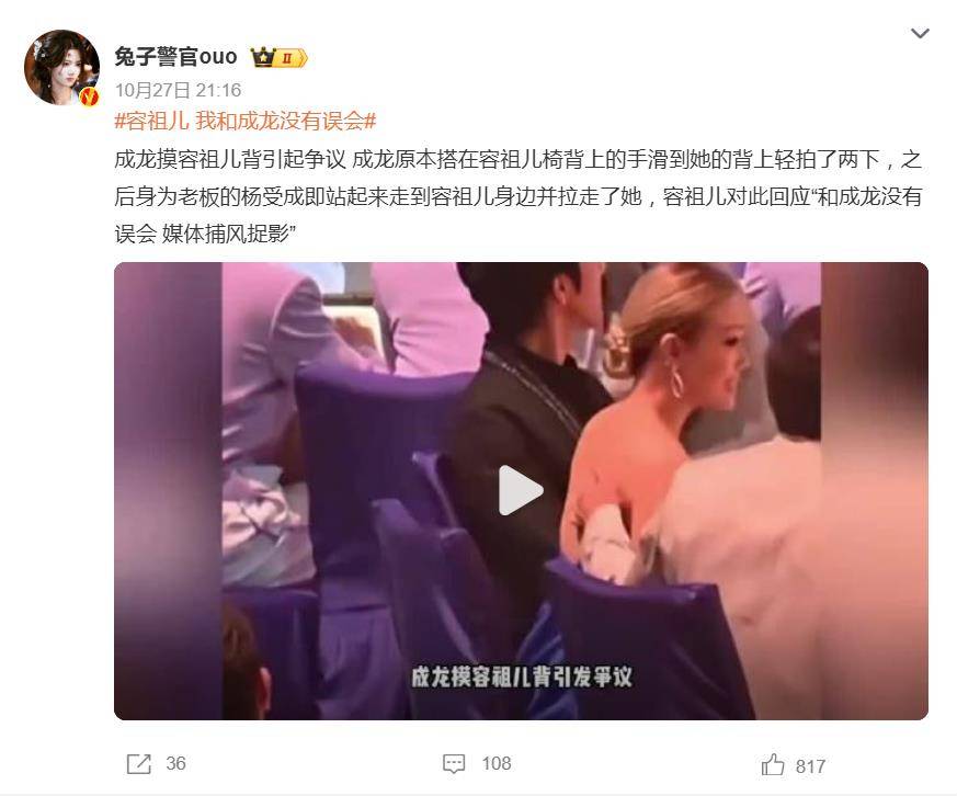 事件要回溯到2025年9月28日的“湾区升明月”晚会。当晚主桌就座时,成龙原本搭在椅背上的手自然滑落,轻拍了身着露背礼服的容祖儿背部两下。就是这瞬间的动作,被部分港媒精准捕捉并放大,渲染成“成龙越界揩油”,瞬间点燃了舆论场。