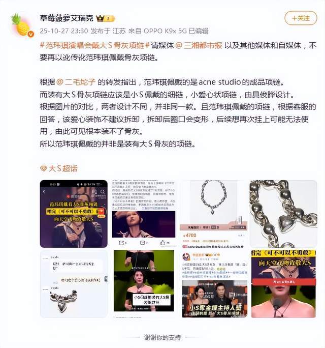 乍一听挺唬人,但很快就被“扒皮”打脸。经过时尚博主和网友的仔细比对,范玮琪演唱会戴的项链,实则是瑞典品牌Acne Studios的复古心形吊坠,黑色设计虽然乍看有几分相似,但款式与小S公开承认的骨灰项链“细链爱心款”明显不同。这波操作,被网友调侃为“媒体看图说话过了头”。
