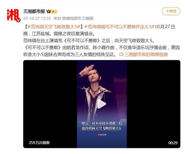 10月27日,范玮琪在江苏盐城的一场演唱会上,用一曲《可不可以不勇敢》和一个深情的天空飞吻,为逝去的好友大S送上了自己的悼念。这一幕迅速冲上热搜,但随之而来的,却是一场关于一