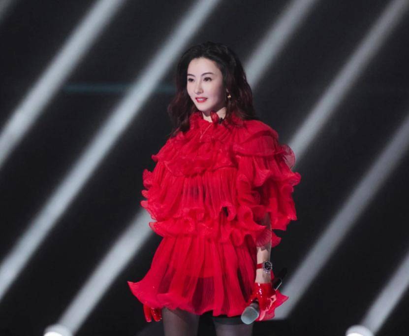 黎姿穿着灰色的外套,苹果肌肿胀得像塞了两个馒头,笑起来嘴角僵硬得像戴了面具,和旁边45岁素颜出镜的张柏芝形成鲜明对比。