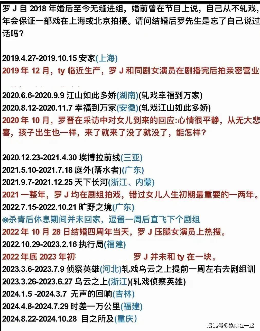 这话一出来,立马就有人扒以前的细节。有人说,早在结婚前,罗晋就说过婚后会尽量在北京和上海拍戏,因为唐嫣常住这两个地方,可婚后根本不是这么回事儿!从罗晋的行程来看,他这几年拍的戏,不是在浙江、江苏,就是在四川、云南,很少在上海本地拍,有时候一拍就是三四个月,连春节都不一定能回家。还有人说,孩子成长的关键时期,罗晋缺席了好多重要时刻。比如孩子第一次说话、第一次走路,罗晋都是在外地拍戏,只能通过视频看一眼;孩子生病的时候,也都是唐嫣一个人带着去医院,又当爹又当妈。为了方便照顾孩子,唐嫣还把自己的父母接到上海一起住,有老人帮忙,能轻松点。