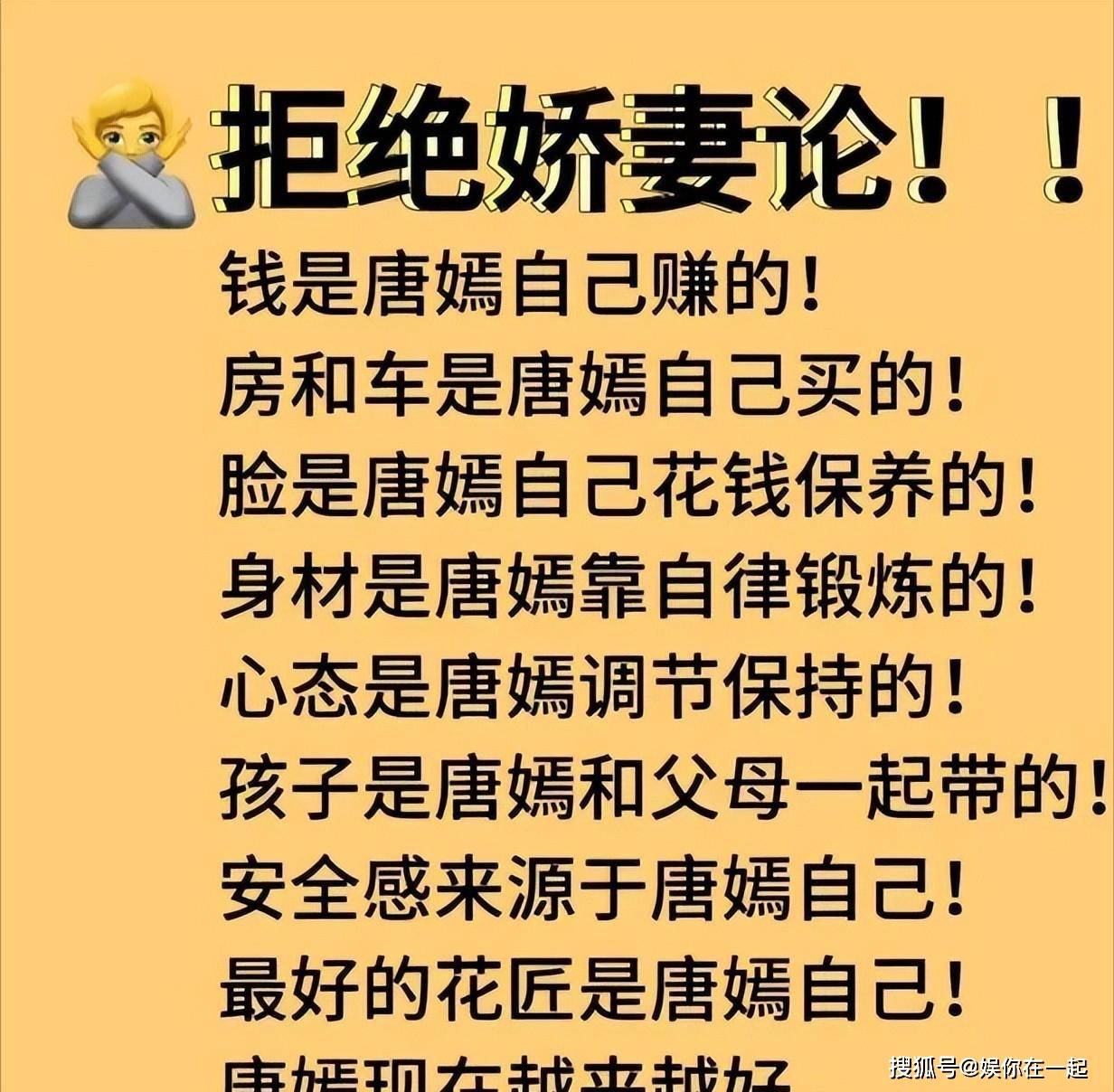 事情的起因,是一张 “拒绝娇妻论” 的照片在网上流传。照片里列了好多唐嫣这些年的成就,比如拍了多少部爆款剧、拿了多少奖、代言了多少大品牌,还特意强调 “这些都是唐嫣自己拼来的,不是靠罗晋”。本来这也就是粉丝为唐嫣抱不平,觉得她不该被贴上 “罗晋妻子” 的标签,结果没想到,这张照片居然引发了连锁反应!有网友开始爆料,说唐嫣和罗晋现在早就分居了,罗晋常年在外地拍戏,很少回上海的家,唐嫣一个人带着孩子,活成了 “丧偶式婚姻”。