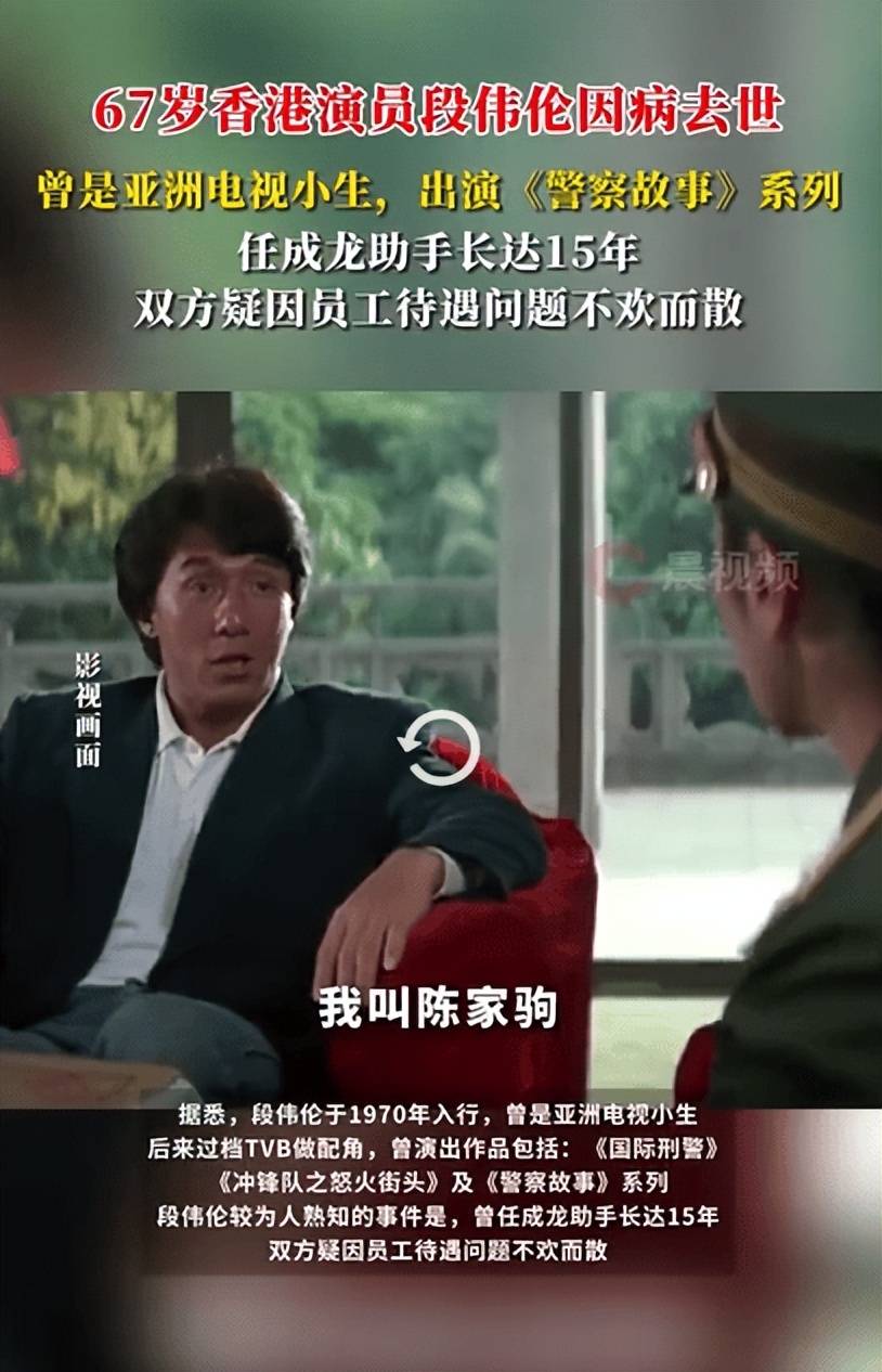 据悉,段伟伦于1970年入行,曾是亚洲电视小生,后来过档TVB做配角,曾演出作品包括:《国际刑警》、《冲锋队之怒火街头》及《警察故事》系列。段伟伦较为人熟知的事件是,曾任成龙助手长达15年,双方疑因员工待遇问题不欢而散。