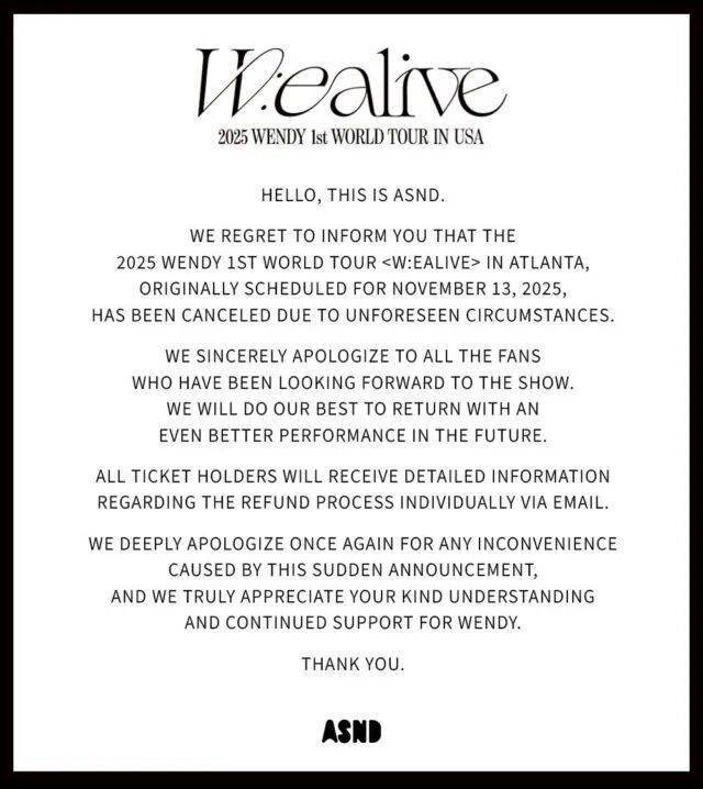 事情起源于10月28日,ASND公司通过官方X账号突然宣布,原定于11月13日举行的Wendy亚特兰大站演唱会正式取消。声明写得相当“官方”,仅甩出“不可抗力因素”这个万金油理由,外加一句标准化的道歉和退票承诺,便再无任何实质解释。