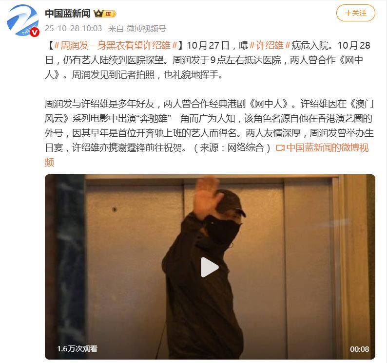 10月28日上午9点,一身黑色衣帽的周润发悄然现身香港九龙塘医院,步履匆匆地前往病房区,只为探望一位相交超过46年的老友——正在病危中的许绍雄。