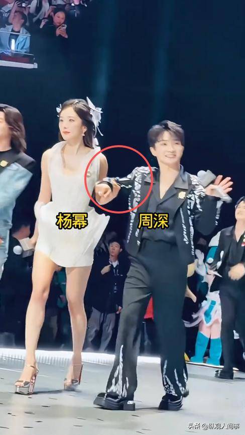 上场时,她用手搭着周深的手,身材比例尽显,胸以下全是腿,看起来非常高挑。