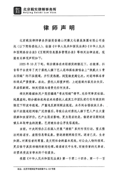 近日,范玮琪在演唱会上佩戴项链被指是大S骨灰项链,对此,范玮琪方发布律师声明,称此事完全失实,相关项链与遗骨没有任何关系。