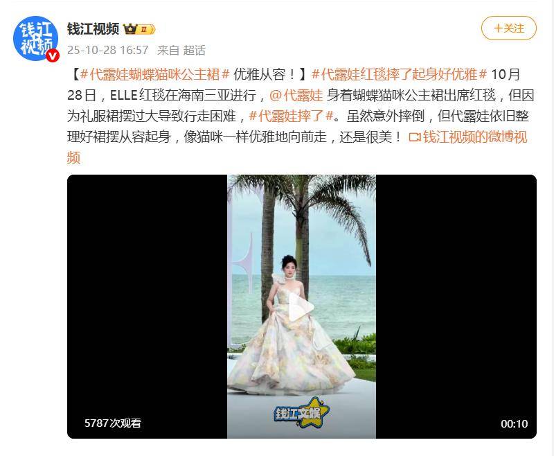 10月28日,海南三亚的ELLE 80周年风尚大典红毯上,演员代露娃一袭巨型蝴蝶造型蓬蓬裙惊艳亮相,却因裙摆被绊,在红毯台面上意外摔倒。这猝不及防的一幕,瞬间成为全网关注的焦点。