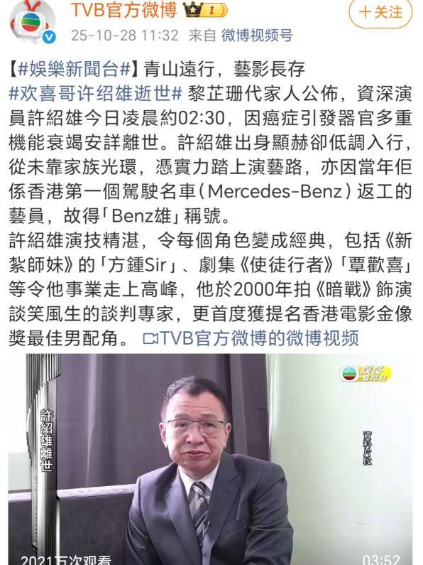 第一个是许绍雄,大家都很熟的面孔了,那个笑眯眯的,演了很多经典配角的,他因为癌症,最后导致器官衰竭,在凌晨两点半左右走了,