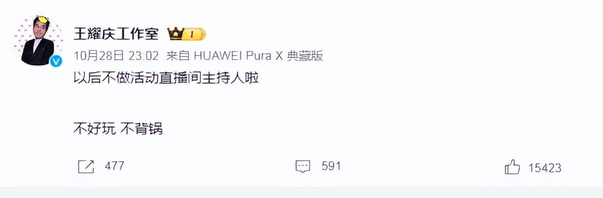 王耀庆工作室发文:“以后不做活动主持人啦,不好玩不背锅”,被批“推卸责任”“缺乏担当”。