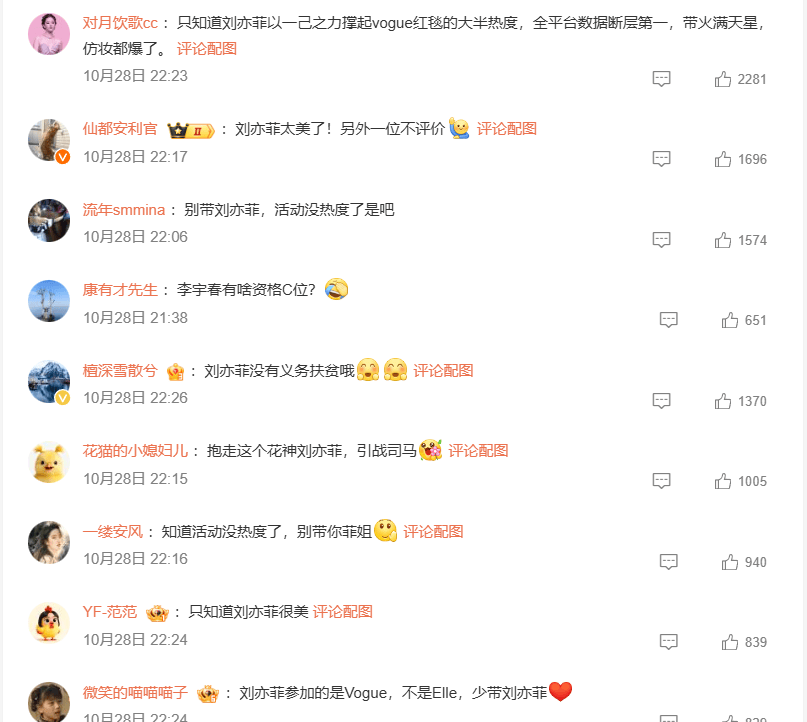 但这样一来矛盾反而转移了,刘亦菲李宇春两位曾经在前辈面前不争C位能同台同框的顶流,现在各自为王,居然不能同台同场了。本来两人这次也是避开了彼此,各种艳压和压轴及C位,但是偏偏就是这样,反而被放在一起比较,于是引发两家粉丝争议,到底两位谁更美更火更有气质更能压轴的争议,双方各执一词,争得不可开交。这或许就是不比作品演技拼人气必然会有的局面,不过双方粉丝各种偏爱不同,没必要硬拼,个人喜欢就好,没必要分个高低胜负。