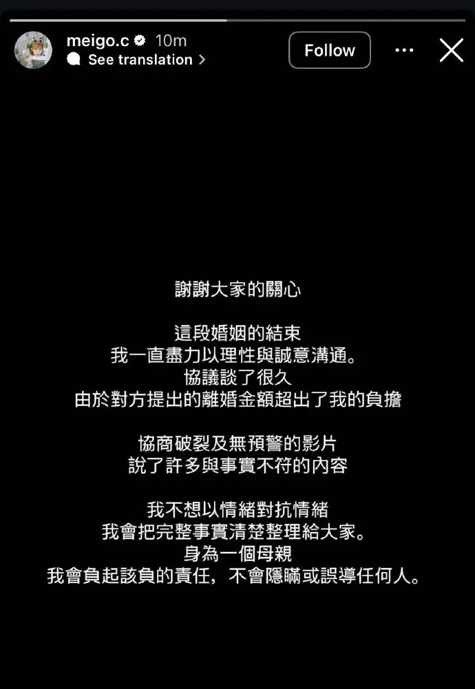 刚刚,粿粿在社交平台发文回应被范姜彦丰爆料出轨王子邱胜翊,称一直在以理性与诚意沟通,但由于对方提出的离婚金额超出负担,协商破裂。她还称范姜彦丰的视频有许多与事实不符的
