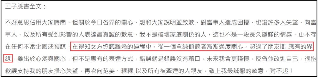 眼看舆论迅速发酵,当事人之一的王子也站出来辟谣,称没有破坏他人婚姻,和粿粿只是朋友。不过他在回应中承认,自己对她闹离婚期间关心过度:“在得知女方协议离婚的过程中,从一个单纯倾听者渐渐过度关心,超过了朋友间应有的界线,虽出于心疼与关心,但不是应有的表达方式,错误就是错误没有借口,未来我会更谨慎。”