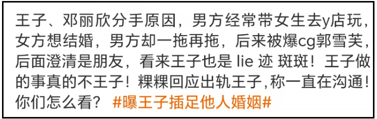 值得一提的是,王子虽然否认插足,但网友剖析他的过往情史,发现他在感情这方面早已劣迹斑斑,不是第一次被传出轨。他的前任是邓丽欣,两人恋爱了三年,但最终却以分手告终。