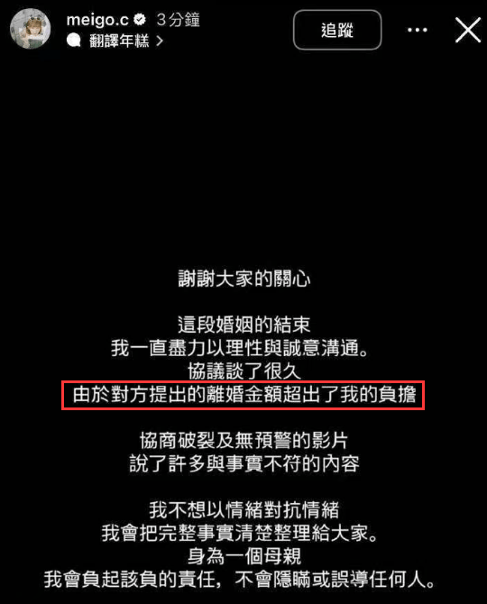 在男方曝光丑闻后,粿粿也通过社交平台回应,她透露自己和范姜彦丰的婚姻已结束,二人正在谈判中,但男方提出的协商金额超过她的负担。此外粿粿还表示,丈夫在视频中透露的信息与事实不符,否认出轨。
