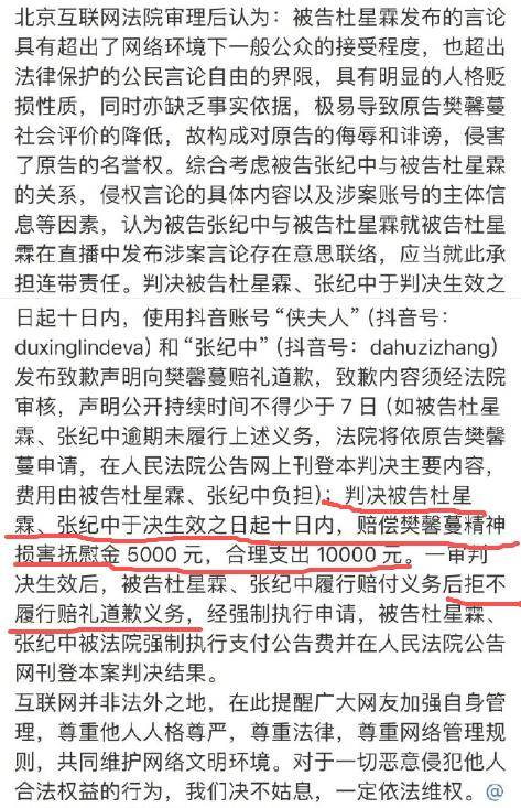 并且,本不该发声的杜也多次在直播中诋毁樊馨蔓,也被告上法庭。