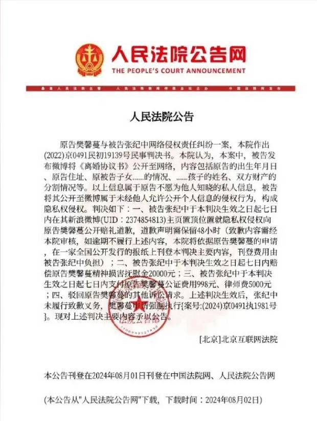 张纪中曾在微博上晒出离婚协议,泄露了樊馨蔓的个人隐私信息,被樊馨蔓告上法庭。