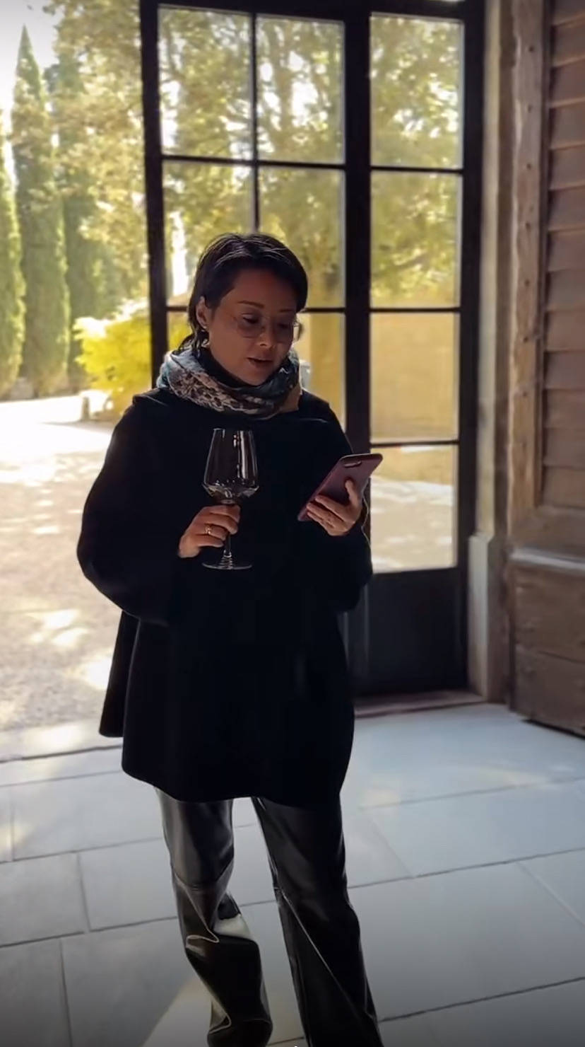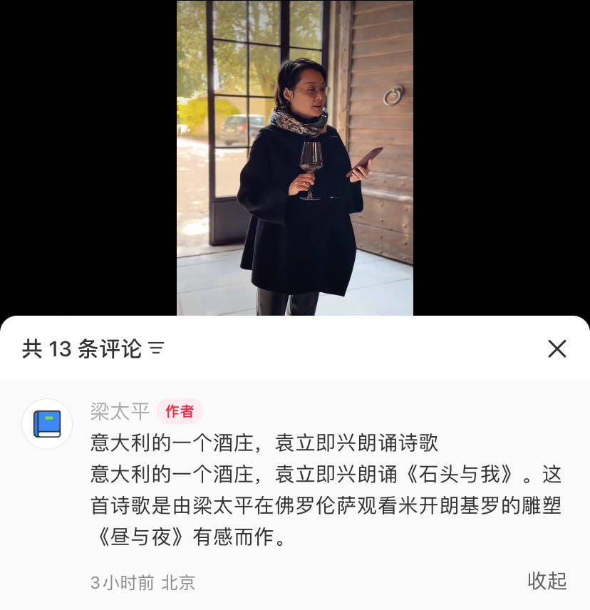 在梁太平的镜头下,53岁的袁立还是那么文艺美好。她穿一件黑色的呢外套,手里端着红酒杯,在意大利的一个酒庄即兴朗诵。