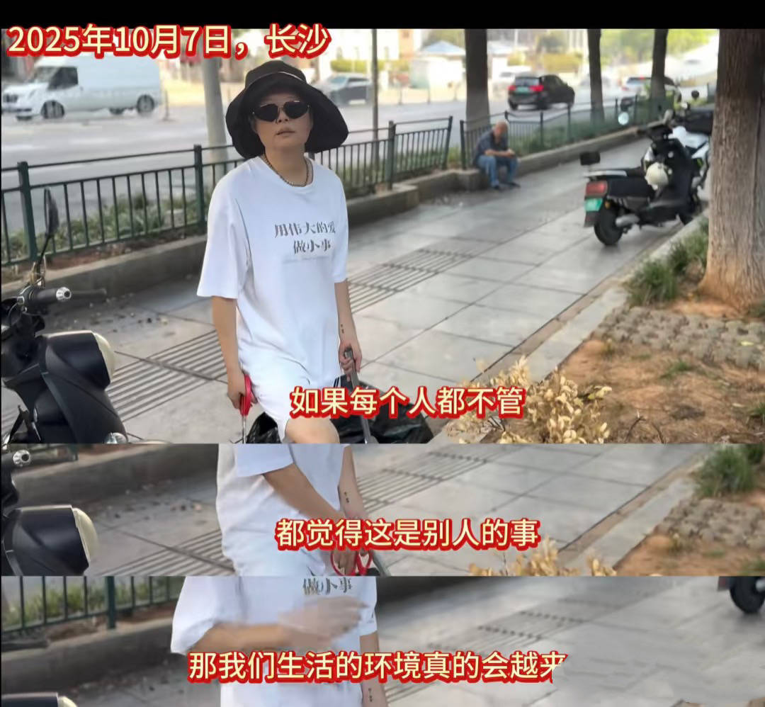 10月7日的时候,袁立还在街头做公益。那时候她穿白色T恤、戴着大大的遮阳帽,在路边打扫卫生,捡了很多狗屎。