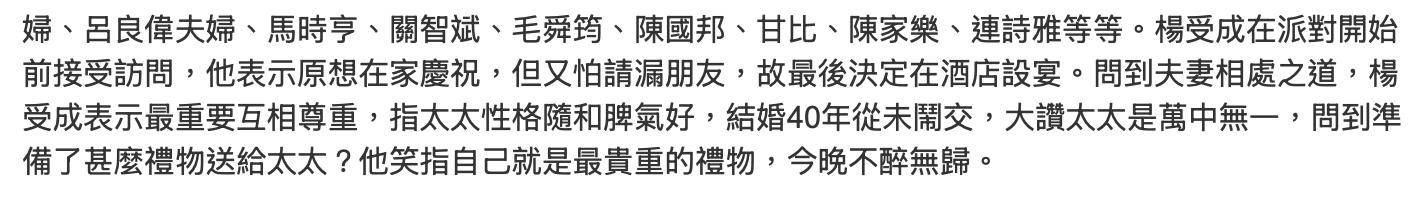 杨受成体谅媒体的辛苦,在晚宴举办之前,专程外出会见媒体,并且向媒体分享夫妻相处之道。他自曝与陆小曼结婚40年从来没有吵过架,还大方赞美太太是万中无一,性格随和,脾气也极好,而彼此在日常相互尊重,方能维持长久的婚姻关系。在被问及送什么礼物给太太的时候,杨受成大方表示,自己就是最贵重的礼物。