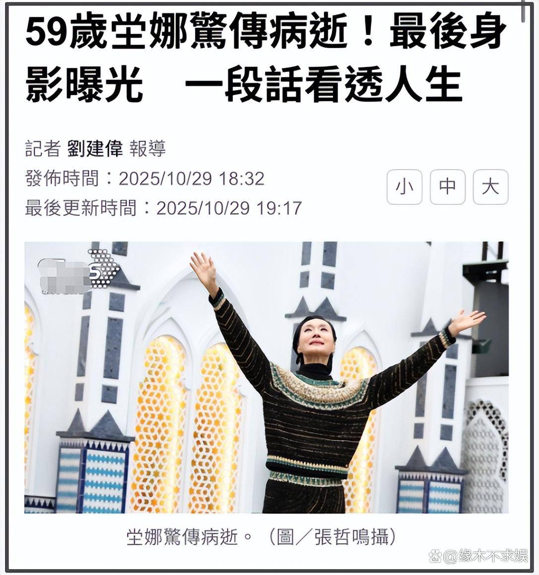 世事无常,这句话从未如此切肤铭心。继TVB老戏骨许绍雄不久前离世后,又一位熟悉的艺人传来噩耗。10月29日,台湾媒体曝出知名歌手坣娜病逝,年仅59岁。令人唏嘘的是,她的离世原因竟