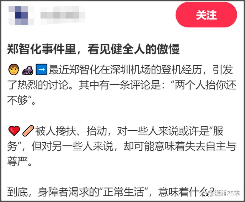 郑智化的发文情绪色彩浓厚,事实上,工作人员是否如他所述“刁难”或“粗暴”,只有他自己感受最为直接。每个人的敏感度不同,何况他是一位残障人士。当周围人都能顺利通过,唯独他被卡住、被仔细审视、被围观乃至讨论时,那种失去自主权利、无法从容生活的体验尤为痛苦。这也是大多数残障人士长期面对却无力改变的现实。