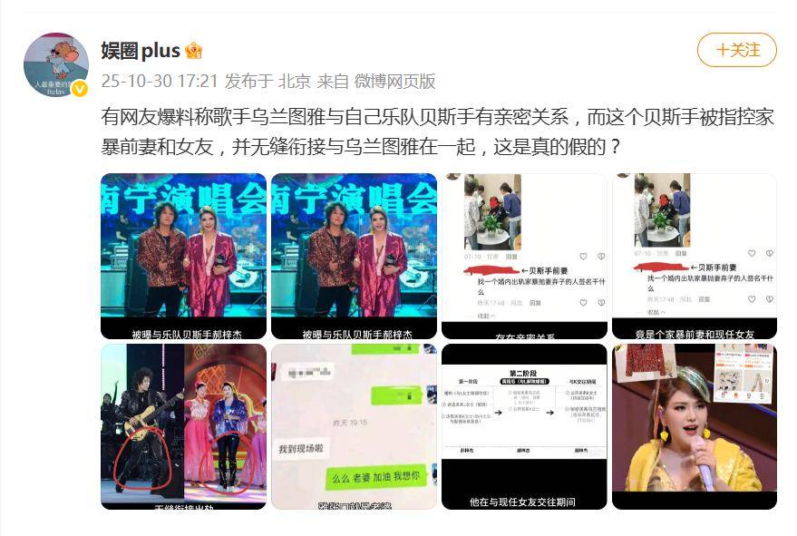 10月30日,网络上一则关于歌手乌兰图雅与自家乐队贝斯手存在亲密关系的爆料,瞬间点燃了吃瓜群众的热情。更劲爆的是,这位名叫郝梓杰的贝斯手被指控曾家暴前妻和女友,并被指无缝