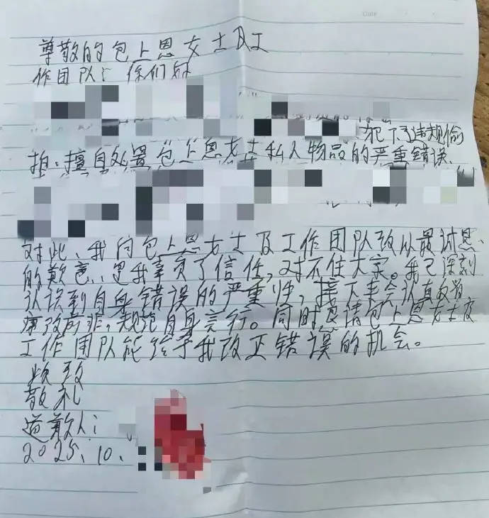 事件发生后,包上恩女士、工作团队、和剧组高度重视,第一时间展开调查核实,并全力追回物品。现涉事司机已就其违规行为提交手写道歉信、交还私扣物品(目前仍在清点核验中)、赔偿损失。后续工作团队将永不录用此人。