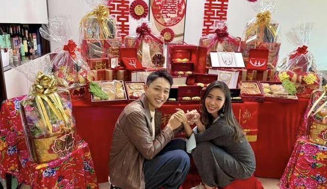 而一对准新人也是特地在这堆大礼前拍了合照,他们都没有刻意的打扮自己,只是穿了休闲装,看起来以舒适度为主,作为准新郎的容天佑看起来依旧十分帅气,他露出招牌式的笑容,而其一旁的未婚妻则是披散着一头长发,看起来女人味十足。