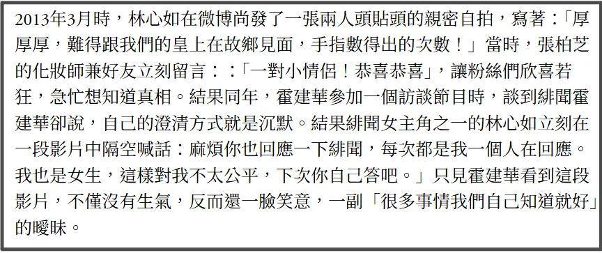 与霍建华暧昧期间,林心如会隔空喊话要求男方及时回应,发文官宣恋情,短短两句话两次强调“我”为主体。