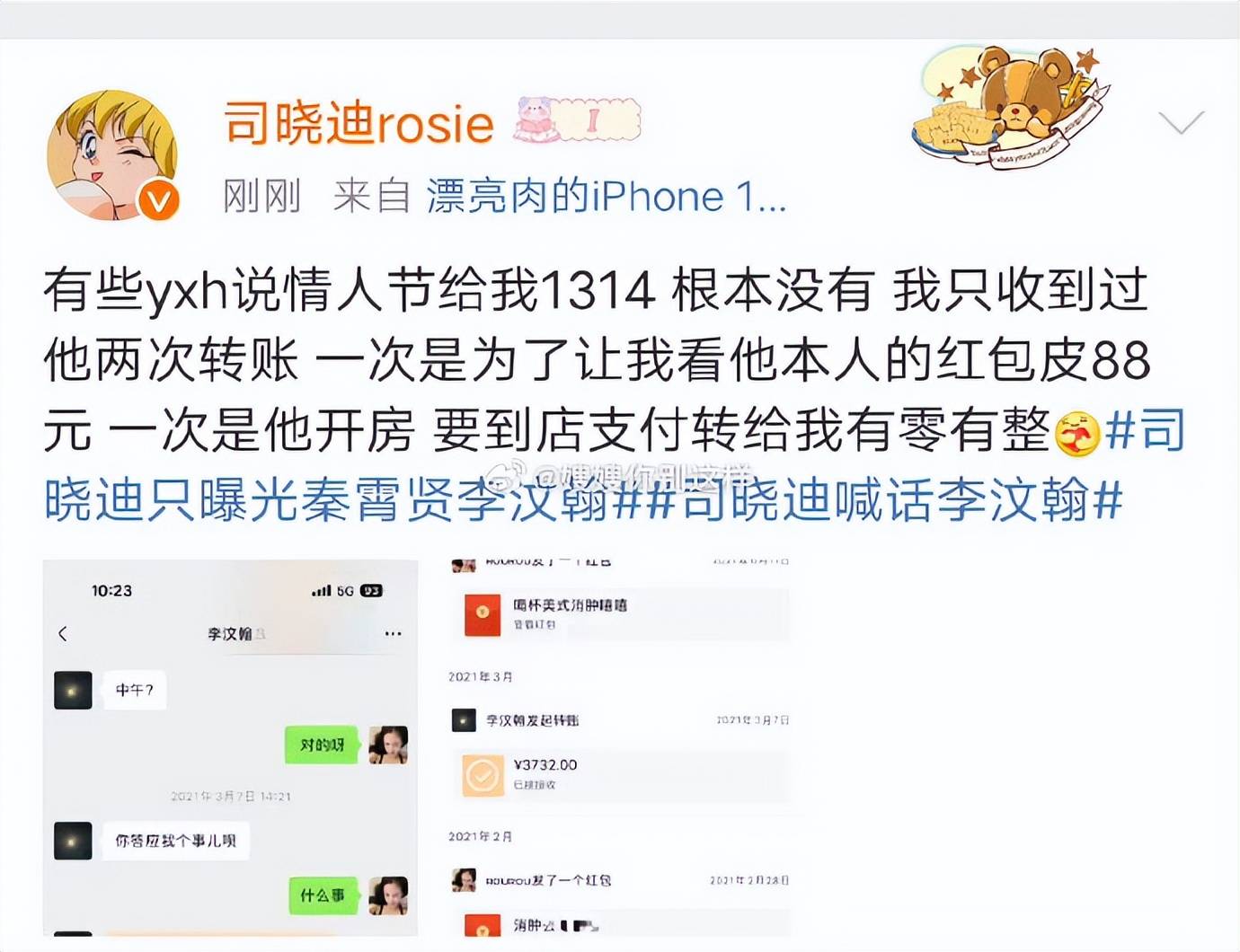另外,司晓迪也确实有“战绩”,曾曝光过秦霄贤不停出轨,伤害自己的感情。今年2月,她又曝光自己跟李汶翰的恋情,并控诉对方和多人保持暧昧关系,还PUA自己,引发舆论热议。