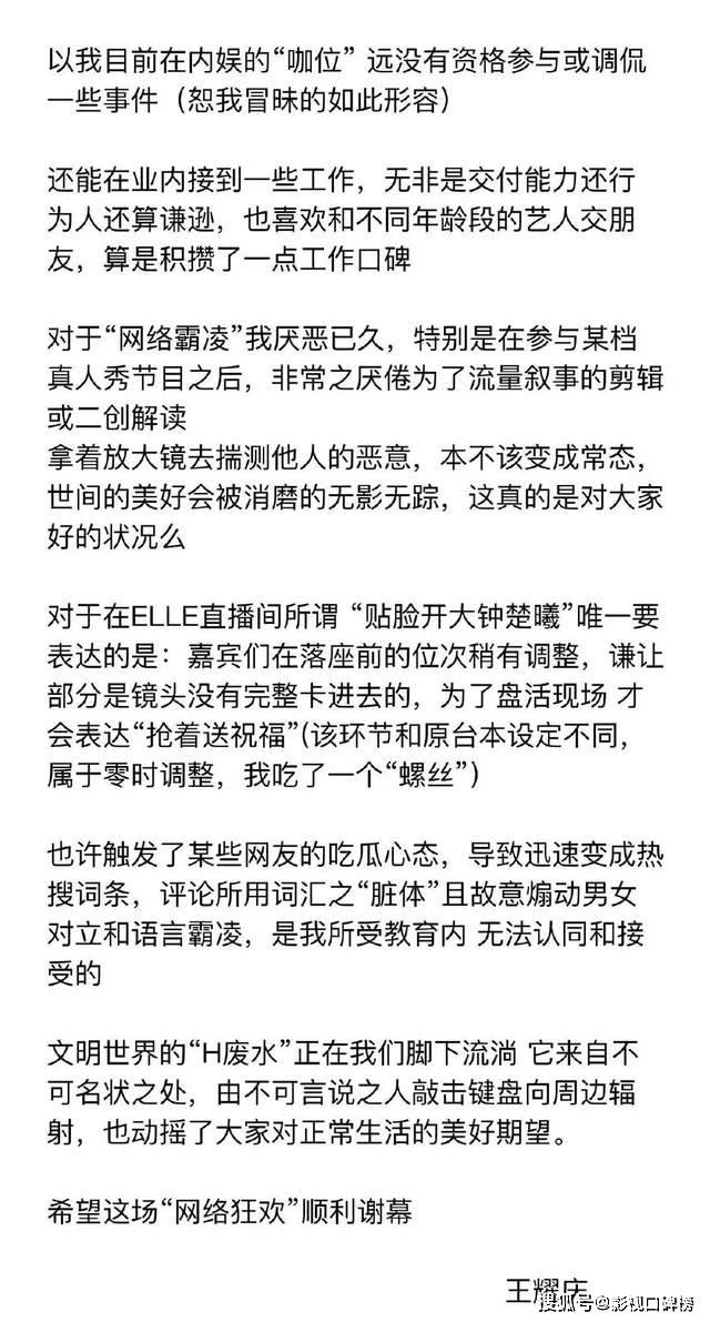 眼见着舆论并不如想象中的一边倒,王耀庆工作室发布声明称“以后不做活动主持人,不好玩不背锅”,却被批评为推卸责任,缺乏诚意。而后王耀庆又发长文澄清,解释重复“抢”字并非故意为之,而是因为台本临时调整后的下意识嘴瓢。本意为“抢着送祝福”,至于网友们的解读纯粹是无中生有,倒显得他是兢兢业业,本本分分,无辜躺枪的受害者。