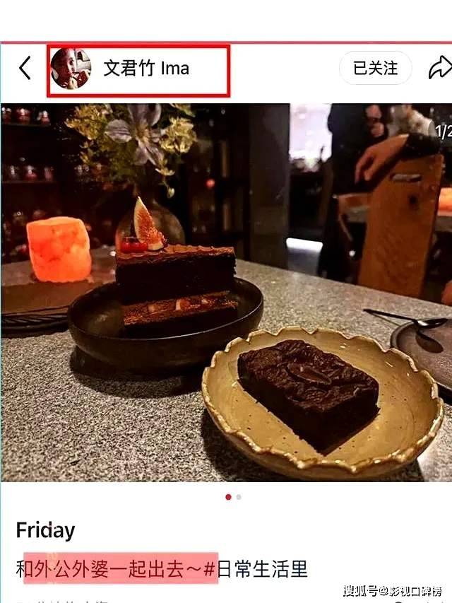 10 月 24 日,马伊琍与文章的大女儿文君竹(小名:文爱马),她在个人社交平台晒出与外公、外婆的合照。配文:和外婆外公一起出去。虽然文案内容不多,但是给人感觉文君竹与外公、外婆很亲近。从小一起生活,感情相对要深厚。