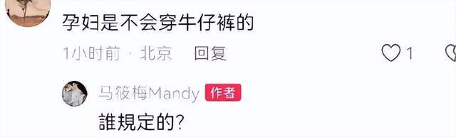 另一边,马筱梅的留言区热闹了。网友问:孕妇谁穿牛仔裤?她直接回了一句:谁规定的?