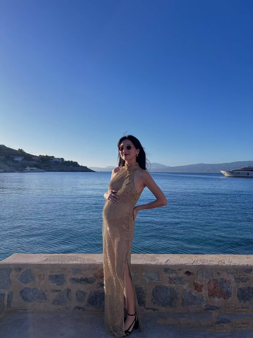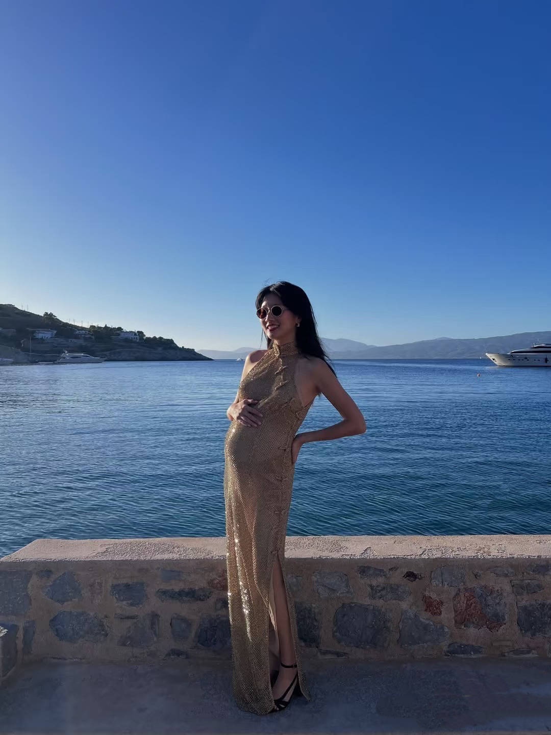 还是郑瑶的单人照好看,她在海边拍照,背景是湛蓝的天空和海水。轻轻向后仰着身子,稍微托着后腰的位置,郑瑶肚大如罗,感觉已经有五六个月的样子了。