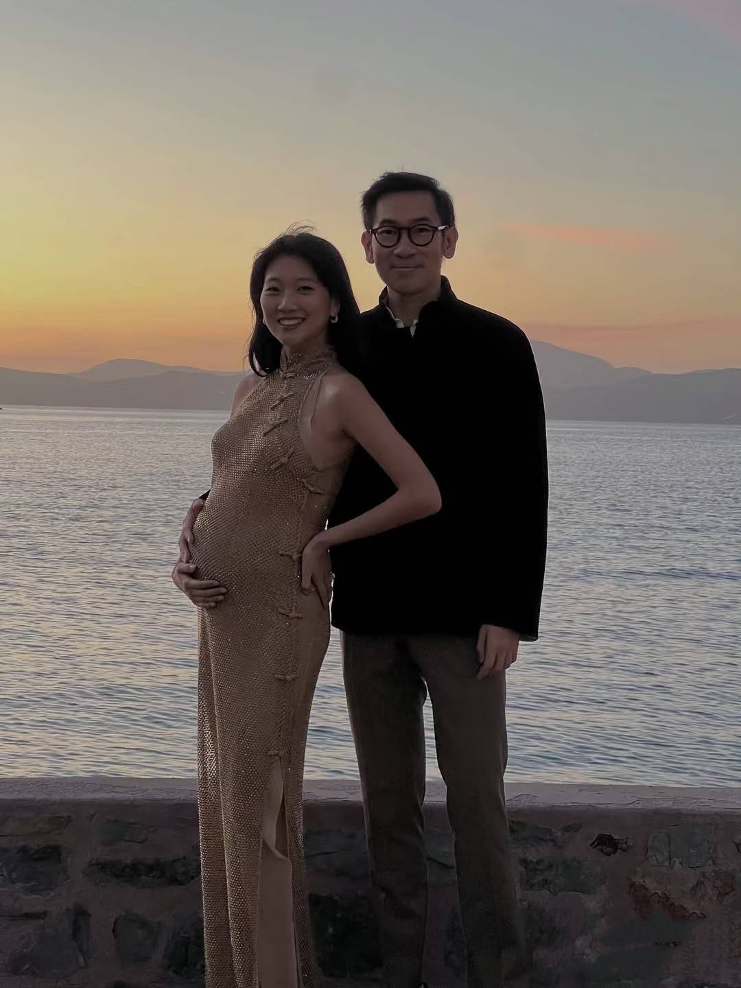 郑瑶穿了一件香槟色的挂脖长裙,有点蕾丝渔网的元素,特别轻盈飘逸。看郑瑶的孕肚,已经非常明显了。