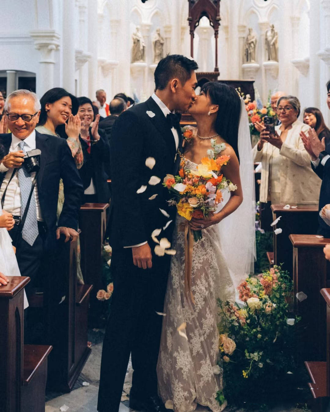 女儿郑瑶的婚礼,办的浪漫盛大。他们举办了西式教堂婚礼,两个人在亲友的见证下亲吻。郑瑶抱着手捧花、穿着白色蕾丝婚纱,美丽大方。