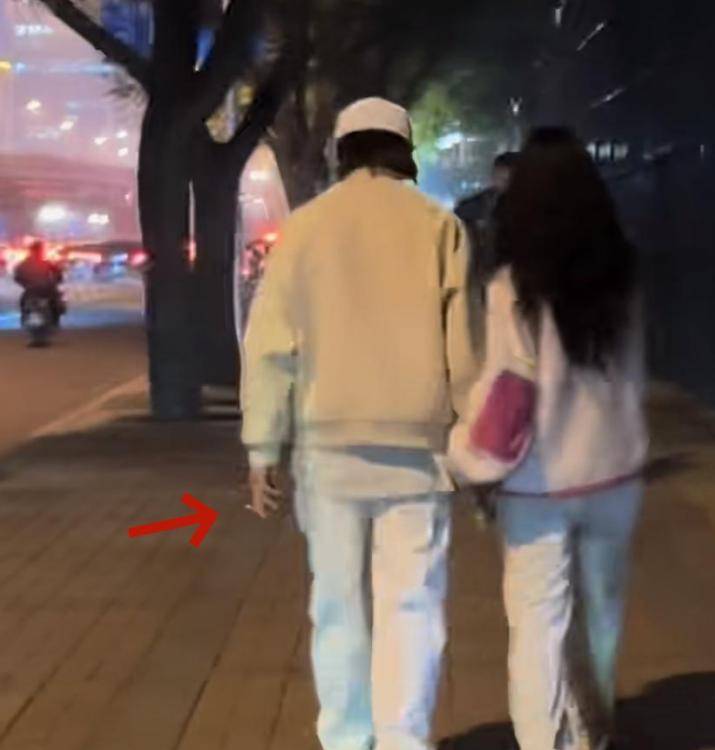 陈羽凡自己呢, 穿得倒是挺低调, 普普通通, 但手里没闲着, 一只手牵着女的, 另一只手夹着烟, 一边走一边抽, 还一边聊天, 看起来心情不错, 挺甜的,